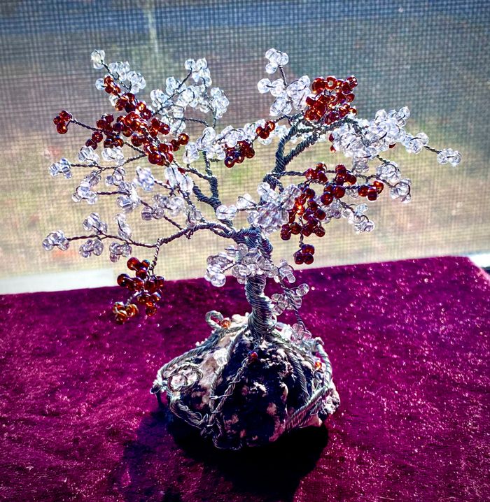 Each idea manifests in its own individual style, I’ve also said the trees makes itself. Each tree is made with glass beads and wire. Some are set on unique rocks found in nature while others have swavarski crystals and are placed on precious stones such as amethyst, quartz, or celestite.